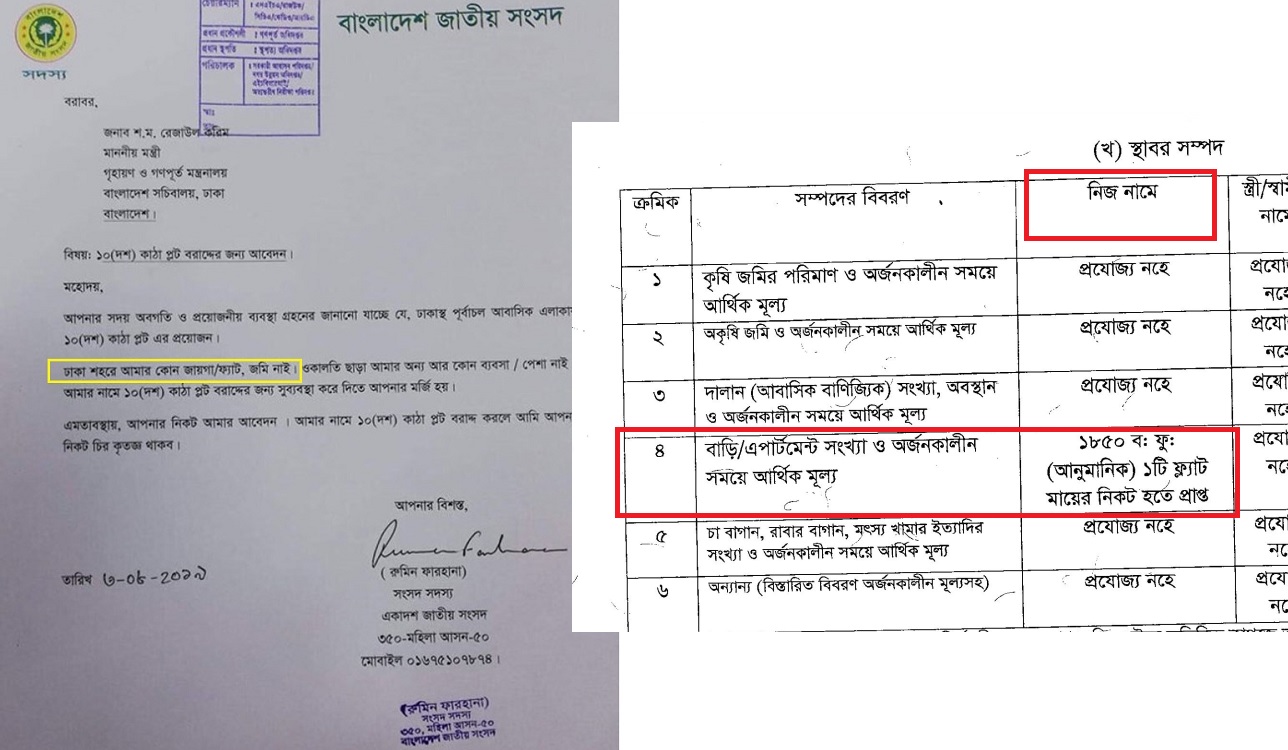 জাতীয় সংসদের সংরক্ষিত আসনে বিএনপি দলীয় সংসদ সদস্য (এমপি) রুমিন ফারহানার একটি আবেদনপত্র প্রকাশিত হয়েছে। যাতে দেখা যাচ্ছে তিনি এমপি কোটায় গৃহায়ণ ও গণপূর্ত মন্ত্রণালয়ে তার নামে ১০ কাঠা জমি বরাদ্দের আবেদন করেছেন।