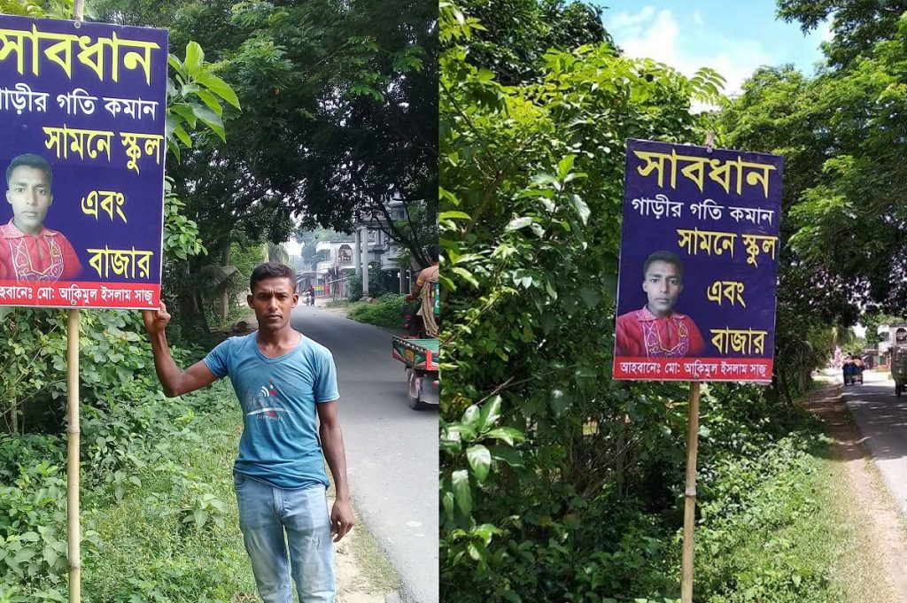 আর এই সাইনবোর্ডগুলো দিয়ে যিনি এলাকার মানুষকে সচেতন করে চলেছেন তিনি পেশায় একজন ভ্যানচালক। আকিমুল ইসলাম ওরফে সাজু (৩০) নামের এই ভ্যান চালক দরিদ্রতার সঙ্গে লড়াই করে শুধু বেঁচে আছেন তাই নয়, নিরবে সমাজের কাজ করে চলেছেন। অন্যরা গাছের সঙ্গে পেরেক ঠুকে নিজেদের প্রচারে যখন ব্যস্ত, সাজু তখন গাছের কথা চিন্তা করে বাঁশের খুটি ব্যবহার করছেন।