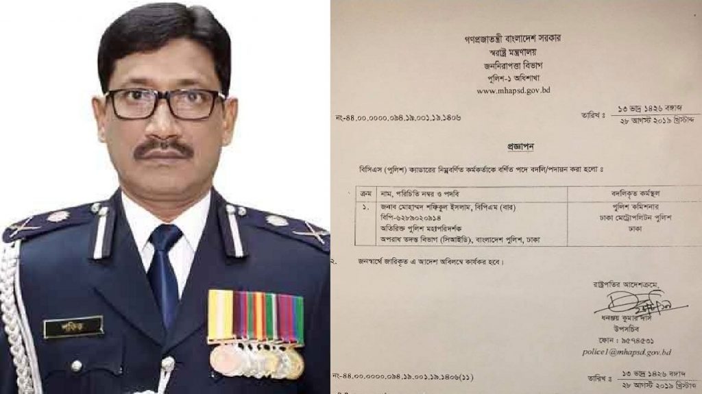 রাষ্ট্রপতির আদেশক্রমে উপ-সচিব ধনঞ্জয় কুমার দাস স্বাক্ষরিত প্রজ্ঞাপনে বলা হয়, অতিরিক্ত পুলিশ পরিদর্শক মোহাম্মদ শফিকুল ইসলামকে ঢাকা মেট্রোপলিটনের পুলিশ কমিশনার হিসেবে বদলি করা হলো। জনস্বার্থে জারিকৃত এ আদেশ অবিলম্বে কার্যকর হবে।