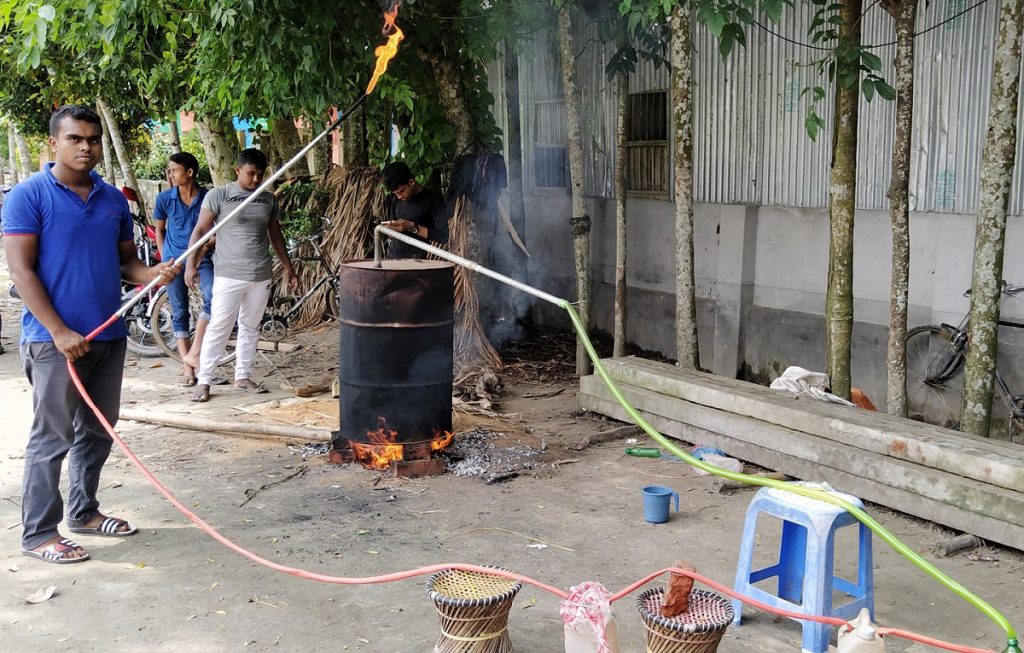 বাড়ির সামনেই একটি আবদ্ধ খালি তেলের ড্রামের সাথে পাইপের মাধ্যমে একটি বোতল এবং দু’টি জেরিকেন সংযোগ করেছেন। খালি ড্রামের ভেতর বেশ কিছু প্লাস্টিক ভরিয়ে ড্রামের মুখ বন্ধ করে দেয়া হয়। এরপর ড্রামের তলায় আগুন জ্বালিয়ে উচ্চ তাপ প্রয়োগের মাধ্যমে প্লাস্টিকগুলোকে গলানো হয়। এভাবে প্রায় ২০/৩০ মিনিট পর্যন্ত তাপ দেয়া হয়। প্লাস্টিক গুলো পুরোপুরি গলে গিয়ে বাষ্পাকারে পাইপের মাধ্যমে বোতলে ফোঁটা-ফোঁটা আকারে পড়তে থাকে। আর এর সবই হচ্ছে ডিজেল, পেট্রোল ও অকটেন। জেরিকেনের মধ্যে অপর একটি পাইপ দিয়ে বের আসছে এলপি গ্যাস। যা দিয়ে সে অনায়াসে প্লাস্টিক পোড়ানো কাজ করছেন। উৎপাদিত জ্বালানি তেল রোস্তম নিজস্ব মটর সাইকেলে ব্যবহার করছেন। পাশাপাশি গ্রামবাসী ও স্বজন-বন্ধু-বান্ধবদেরও দিচ্ছেন।