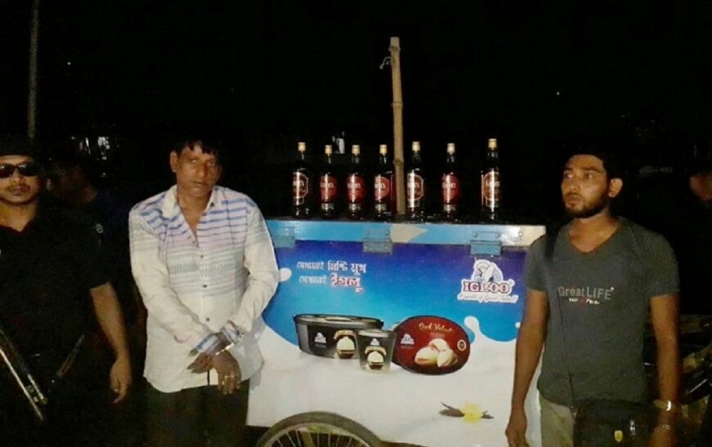 র্যাব-১১, সিপিসি-১ এর পুলিশ সুপার এনায়েত হোসেন মান্না জানান, গোপন সংবাদের ভিত্তিতে সন্ধ্যা থেকেই মুন্সীগঞ্জ শহরের থানা সংলগ্ন জগদ্ধাত্রীপাড়া রাস্তায় নজরদারিতে রাখা হয়। রাত সোয়া নয়টার দিকে সন্দেহ হওয়ায় রাস্তায় একটি আইসক্রিমের ভ্যানের ভিতর তল্লাশি চালিয়ে ৭টি মদের বোতল উদ্ধার করা হয়। এ ঘটনায় ২ জনকে আটক করা হয়েছে। এদের মধ্যে লিয়াকত ৪টি মাদক মামলা সহ চিহ্নিত মাদক ব্যবসায়ী। মাদক বিক্রিতে ব্যবহৃত আইসক্রিম ভ্যান জব্দ করা হয়েছে।