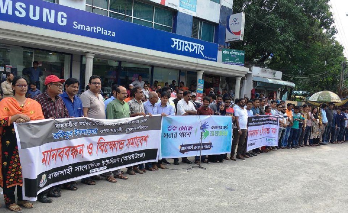 দৈনিক কালের কণ্ঠের রাজশাহী ব্যুরো প্রধান রফিকুল ইসলামের ওপর সন্ত্রাসী হামলার প্রতিবাদে মানববন্ধন ও বিক্ষোভ সমাবেশ করেছে রাজশাহী সাংবাদিক ইউনিয়ন (আরইউজে)। রোববার বেলা সাড়ে ১০টায় নগরীর আলুপট্টি মোড়ে অনুষ্ঠিত মানববন্ধনে উপস্থিত সাংবাদিকরা রফিকের ওপর হামলার তীব্র নিন্দা জানান এবং এ বিষয়ে সুষ্ঠু তদন্ত সাপেক্ষে দোষীদের বিরুদ্ধে ব্যবস্থা নেয়ার আহ্বান জানিয়ে বক্তব্য রাখেন।