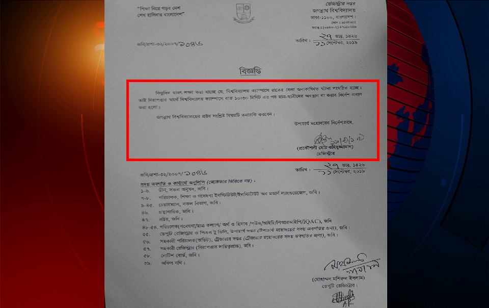 বিশ্ববিদ্যালয়ের রেজিস্ট্রার প্রকৌশলী মো: ওহিদুজ্জামান স্বাক্ষরিত এই বিজ্ঞপ্তিতে বলা হয়,‘কিছুদিন যাবৎ লক্ষ্য করা যাচ্ছে যে, বিশ্ববিদ্যালয় ক্যাম্পাসে রাতের বেলা অনাকাঙ্খিত ঘটনা সংঘঠিত হচ্ছে। তাই নিরাপত্তার স্বার্থে বিশ্ববিদ্যালয় ক্যাম্পাসে রাত ১০:৩০ মিনিট এর পর ছাত্র-চাত্রীদের অবস্থান না করার নির্দেশ প্রদান করা হলো।