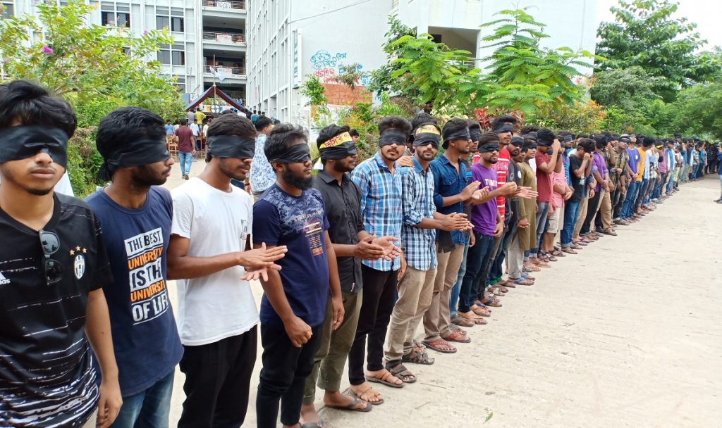 চোখে কালো কাপড় বেধে ভিসির নানা অনিয়ম দুর্নীতির প্রতিবাদ জানিয়েছে গোপালগঞ্জের বশেমুরবিপ্রবির শিক্ষার্থীরা। এরআগে আজ বৃহস্পতিরা সকাল ১১ টায় জয় বাংলা চত্বরে প্রেস ব্রিফিং করে শিক্ষার্থীরা।