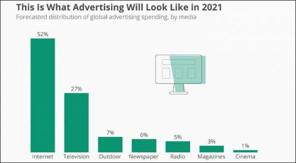 ২০২১ সালে বিশ্বব্যাপী বিজ্ঞাপনের ৫২ শতাংশই প্রচার হবে অনলাইনে। আর ছাপা পত্রিকায় প্রকাশ হবে মাত্র ৬ শাতংশ। লন্ডনভিত্তিক মিডিয়া এজেন্সি জেনিথ অপটিমিডিয়া তাদের বিশ্লেষণে এ তথ্য জানিয়েছে।