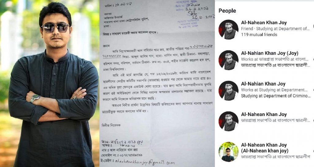 গত ১৪ সেপ্টেম্বর ছাত্রলীগের ভারপ্রাপ্ত সভাপতির দায়িত্ব পান আল নাহিয়ান খান জয়। সাধারণ সম্পাদকের দায়িত্ব দেয়া হয় লেখক ভট্টাচার্যকে। দায়িত্ব পাওয়ার দিন থেকেই জয়ের নামে ফেসবুকে একাধিক ফেক আইডি খোলা হয়। এসব অ্যাকাউন্টে কোনোটায় বঙ্গবন্ধু শেখ মুজিবুর রহমানের ছবি, কোনোটায় আওয়ামী লীগ সভাপতি শেখ হাসিনার ছবি আবার কোনোটায় আল নাহিয়ান খান জয়ের ব্যক্তিগত ছবি ব্যবহার করা হয়েছে।