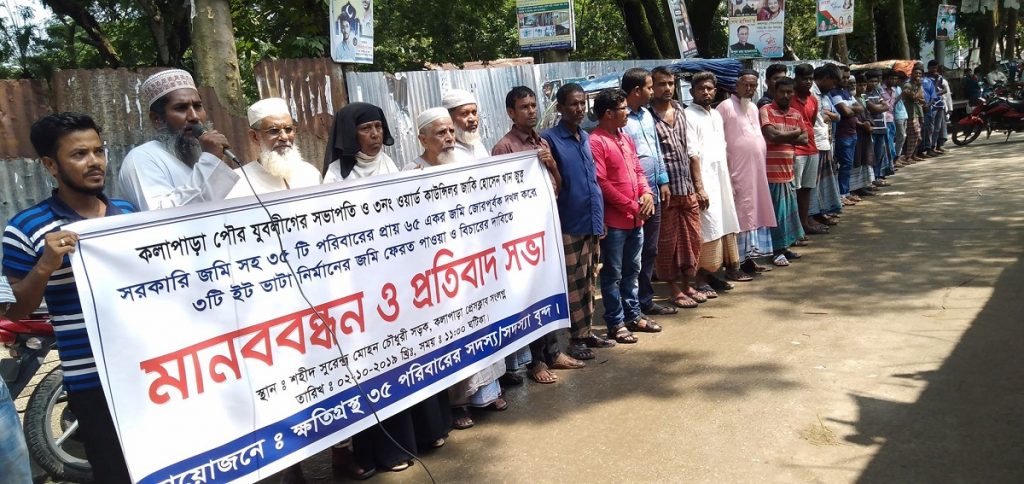 পটুয়াখালীর কলাপাড়া পৌর যুবলীগ সভাপতি ও কাউন্সিলর জাকির হোসেন জুকুর বিরুদ্ধে সরকারি জমিসহ ৬৫ একর জমি জবর দখল করার প্রতিবাদে এবং জমি ফেরত পাওয়ার দাবিতে মানববন্ধন ও প্রতিবাদ সভা করেছে মুক্তিযোদ্ধ পরিবারসহ ক্ষতিগ্রম্ত ৩৫টি পরিবার। ক্ষতিগ্রস্ত পরিবার জমি ফেরত পেতে প্রশাসনের হস্তক্ষেপ কামনা করে।