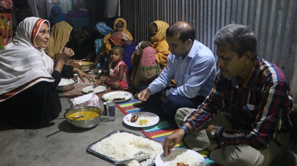 জেলা প্রশাসক আর বৃদ্ধাদের আলাপচারিতার মধ্যেই রাতের খাবার চলে এলো। তছলিমা তার অপর এক সহযোগীকে নিয়ে খাবার পরিবেশন করলেন। তিনি আগে থেকেই রান্না করে রেখে ছিলেন। এক সারিতে বসে খাবার খেলন জেলা প্রশাসক হারুন অর রশিদ। সবাইকে মিষ্টি মুখ করালেন ডিসি। খাওয়া শেষ হলো। যেন আলাপচারিতা যেন শেষ হলোনা। প্রবীণদের জন্য কিছু সু-ব্যবস্থার আশ্বাস দিলেন জেলা প্রশাসক।