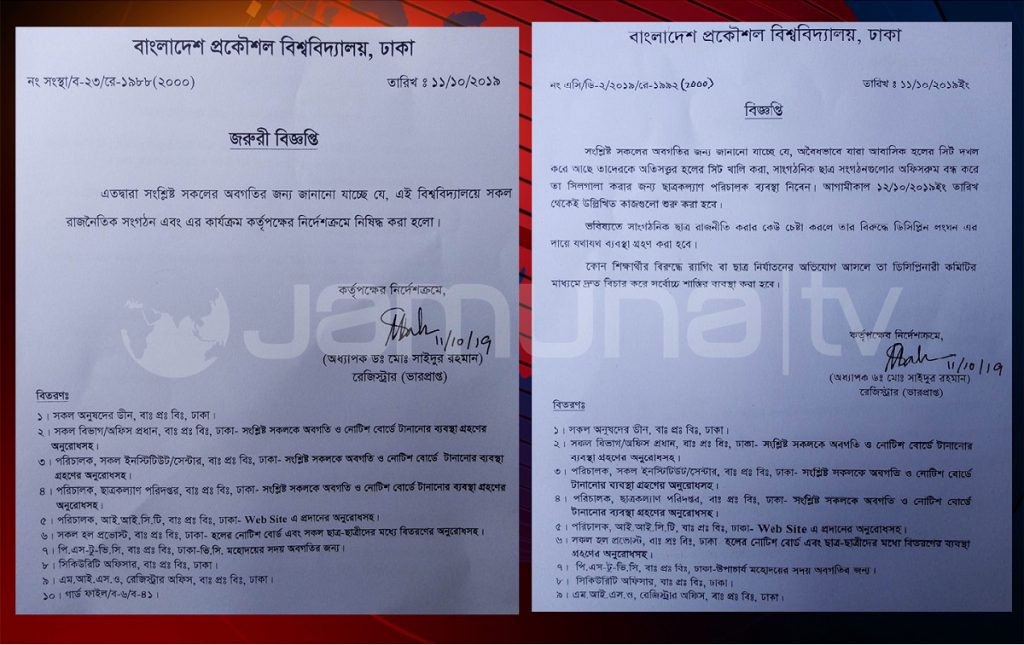 একইসাথে পৃথক আরেক বিজ্ঞপ্তিতে বুয়েটের আবাসিক হলগুলোতে যারা অবৈধভাবে অবস্থান করছেন তাদের সিট খালি করা ও সাংগঠনিক ছাত্র সংগঠনগুলোর অফিসরুম বন্ধ করে তা সিলগালা কারার জন্য ছাত্রকল্যাণ পরিচালককে ব্যবস্থা নিতে বলা হয়েছে।