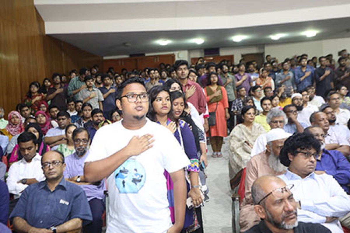 দুপুরে বিশ্ববিদ্যালয়ের অডিটরিয়ামে গণশপথে অংশ নেন বুয়েটের শিক্ষক-শিক্ষার্থী কর্মকর্তা-কর্মচারিরা।