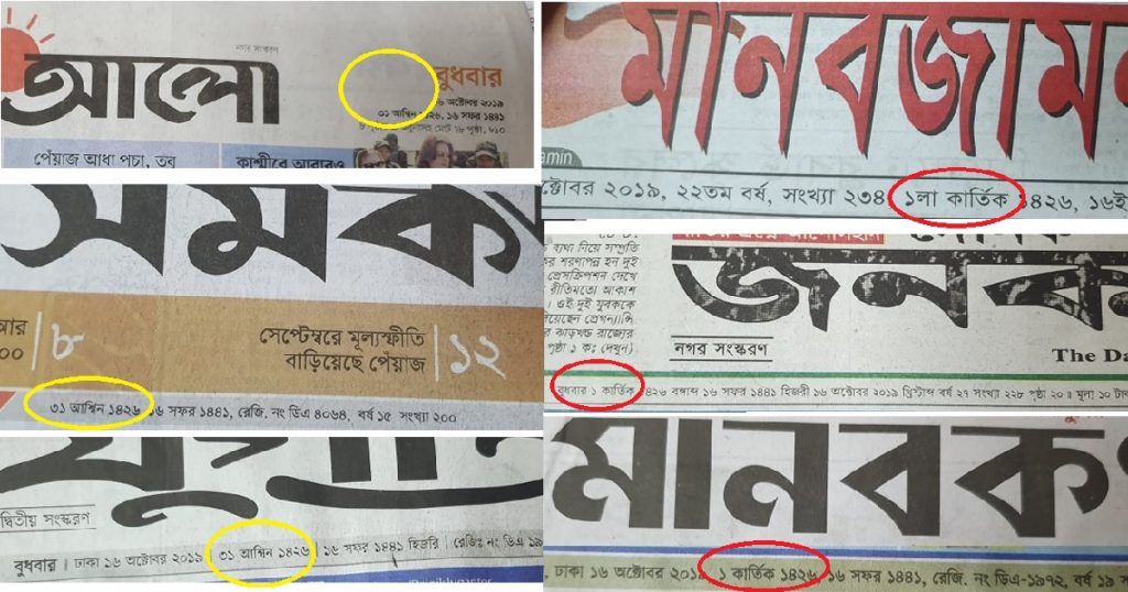 বাংলা একাডেমির পক্ষ থেকে এই নির্দেশনা জারি করা হলেও আজকের জাতীয় পত্রিকাগুলো দেখে বিভ্রান্তি তৈরি হয়েছে। কিছু পত্রিকায় বাংলা একাডেমির নির্দেশনা অনুযায়ী আজ ৩১ আশ্বিন লেখা হয়েছে। বাকিগুলোতে আগের হিসাব অনুযায়ী আজ বুধবার ১ লা কার্তিক গণনা করা হয়েছে। এতে পাঠকদের বিভ্রান্তির মধ্যে পড়তে হয়েছে।