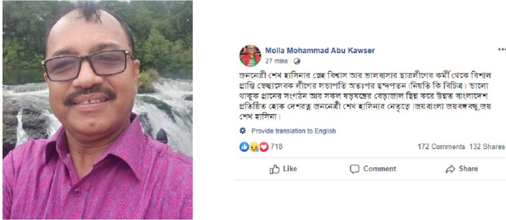 সদ্য অব্যাহতি পাওয়া স্বেচ্ছাসেবক লীগের সভাপতি মোল্লা মো. আবু কাওছার সামাজিক যোগাযোগ মাধ্যম ফেসবুকে নিজের প্রতিক্রিয়া জানিয়েছেন।