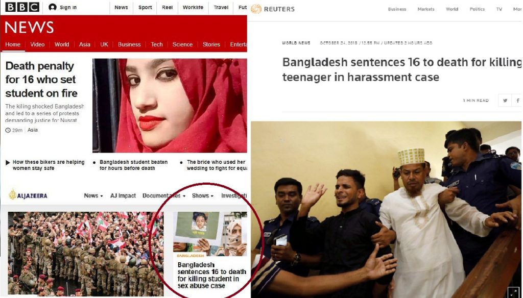 ফেনীর সোনাগাজীর মাদ্রাসাছাত্রী নুসরাত জাহান রাফি হত্যা মামলার রায়ের খবর গুরুত্ব দিয়ে প্রকাশ করেছে আন্তর্জাতিক গণমাধ্যমগুলো। এ তালিকায় আছে বিবিসি, রয়টার্স, এএফপি, আল জাজিরাসহ বিভিন্ন গণমাধ্যম। এ মামলার রায়ে অধ্যক্ষ সিরাজ উদদৌলাসহ ১৬ জনের মৃত্যুদণ্ড দিয়েছেন আদালত।