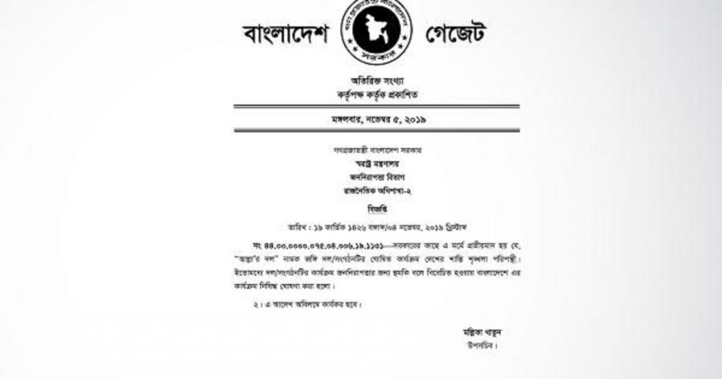 মঙ্গলবার জননিরাপত্তা বিভাগের উপসচিব (রাজনৈতিক শাখা-২) মল্লিকা খাতুন স্বাক্ষরিত এক প্রজ্ঞাপনে এ আদেশ জারি করা হয়েছে। প্রজ্ঞাপনটি গেজেট আকারেও প্রকাশ করা হয়েছে।