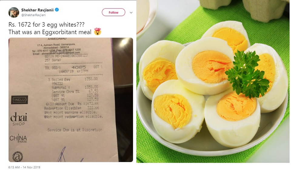 বিল মিটিয়ে তা টুইট করতেই মুহুর্তেই তা ভাইরাল হয়ে যায়। টুইটে তিনি লিখেন, ‘তিনটি ডিমের দাম ১৬৭২ টাকা??? এটি একটি গলাকাটা ভোজ।’