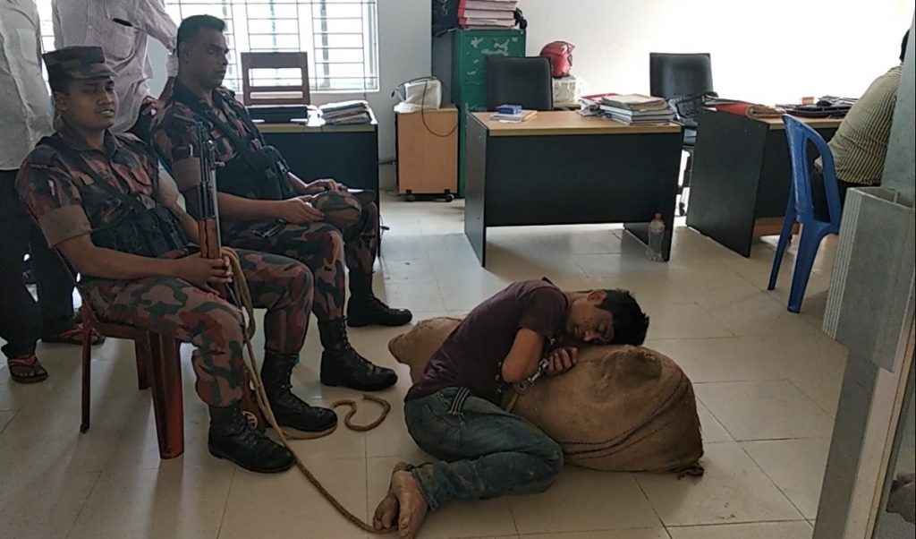 গাঁজার বস্তার ওপর ঘুমিয়ে ছিল পাচারকারী শেখ নয়ন। অনেক ডাকাডাকির পর ঘুম ভাঙে তার।