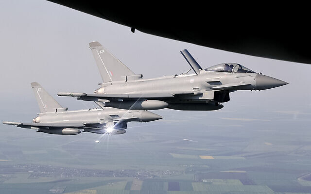 Royal Air Force Eurofighter Typhoon fighter jets escort a transport plane, above eastern Romania, Friday, April 27, 2018. A British squadron made of four fighter jets and 160 personnel received the official certification for reinforced air police mission on NATO's eastern border at the Mihail Kogalniceanu air base, near the Black Sea port city of Constanta. (AP Photo/Vadim Ghirda)