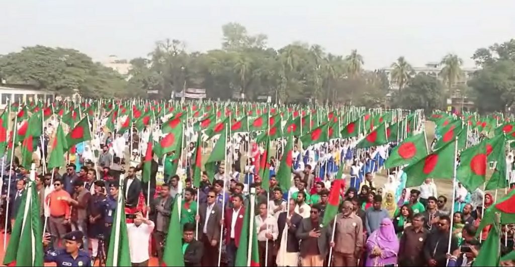 সকাল থেকেই পাবনা সরকারি এডওয়ার্ড কলেজ মাঠে হাজির হয় বিভিন্ন স্কুল-কলেজের শিক্ষার্থী, শিক্ষক ও বিভিন্ন পেশাজীবী মানুষ। আয়োজকদের পক্ষ থেকে উপস্থিত সবার হাতে তুলে দেয়া হয় জাতীয় পতাকা। এরপর সমবেত কণ্ঠে জাতীয় সঙ্গীতে অংশ নেন সবাই।