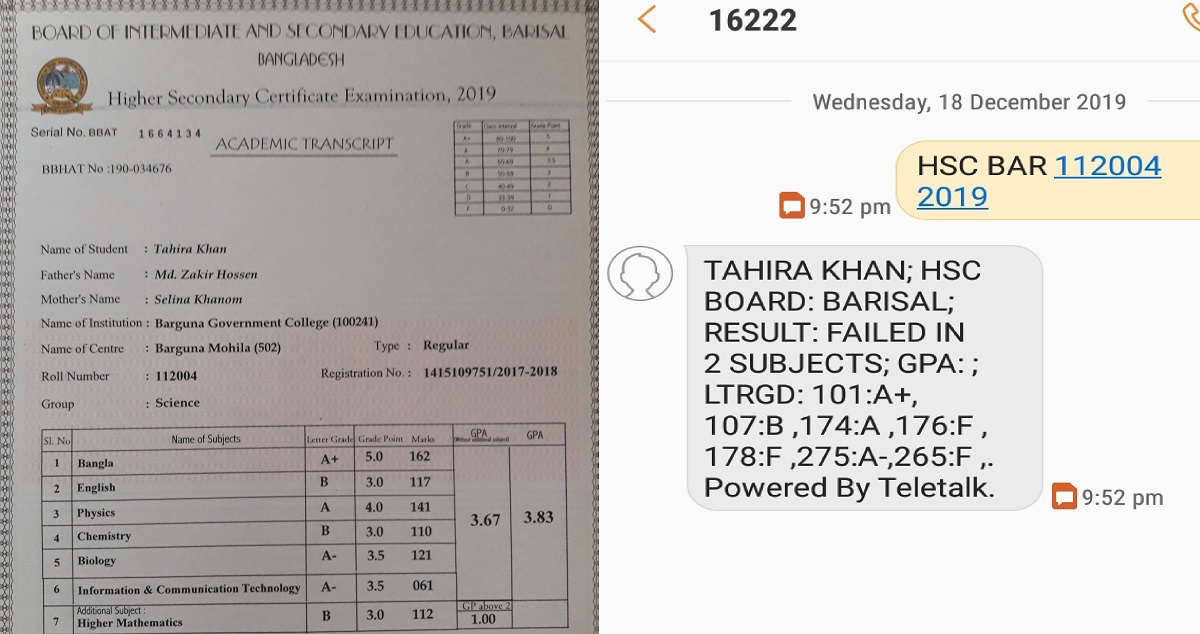 পরীক্ষার ফলাফলের দিন মোবাইল এসএমএস ও ওয়েবসাইটে দেখা যায় বিজ্ঞানের তিন বিষয় অকৃতকার্য, পুনরায় পরীক্ষা দেওয়ার জন্য ফরম পূরণ করতে গিয়ে দেখে সব বিষয় কৃতকার্য। হারিয়ে গেছে শিক্ষা জীবন থেকে একটি বছর। এমন অদ্ভুত কাণ্ড ঘটেছে বরগুনা সরকারি কলেজের ছাত্রী তাহিরা খানের ক্ষেত্রে।