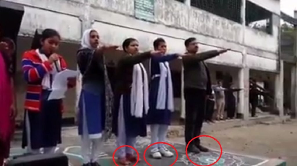 জানাগেছে, আজ সোমবার সকালে কাশিয়ানী উপজেলার রাজপাট বহুমুখী উচ্চ বিদ্যালয়ে শিক্ষার্থীদের শরীর চর্চা করানো হয়। এ সময় ওই স্কুলে নির্মিত শহীদ মিনারে শিক্ষক ও শিক্ষার্থীরা জুতা পায়ে উঠে শপথ বাক্য পাঠ করে।