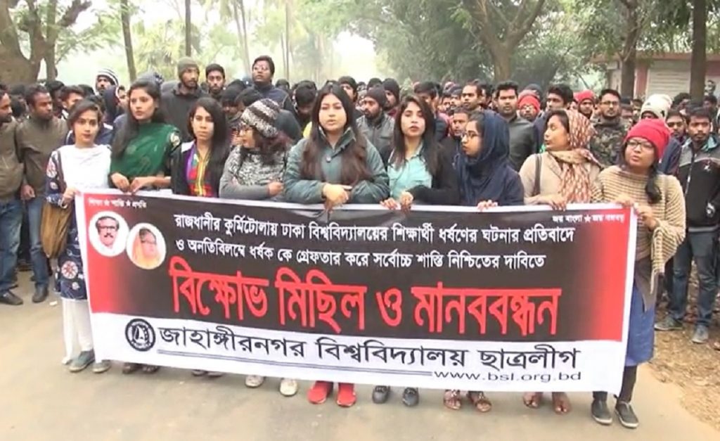 ঢাকা বিশ্ববিদ্যালয়ের শিক্ষার্থী ধর্ষণের ঘটনার প্রতিবাদে বিক্ষোভ মিছিল ও মানববন্ধন করেছে জাহাঙ্গীরনগর বিশ্ববিদ্যালয় শাখা ছাত্রলীগ।