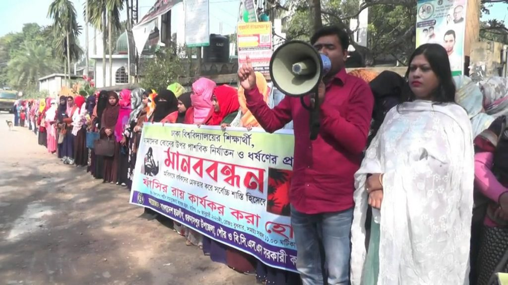 ঢাকা বিশ্ববিদ্যালয়ের শিক্ষার্থীর উপর পাশবিক নির্যাতন ও ধর্ষণকারী মজনুর সর্বোচ্চ শাস্তির দাবিতে নাটোরের গুরুদাসপুরে মানববন্ধন অনুষ্ঠিত হয়েছে। বুধবার দুপুরে উপজেলার শহীদ সামসুজ্জোহা সরকারি অনার্স কলেজের শিক্ষক ও শিক্ষার্থীদের আয়োজনে এই কর্মসূচি পালন করা হয়।