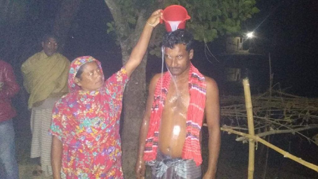 দ্বিতীয় স্ত্রীকে তালাক দেয়ার পর দুধ দিয়ে গোসল করিয়ে স্বামীকে নতুনরূপে বরণ করে নিয়েছেন প্রথম স্ত্রী। অন্যদিকে গ্রামবাসী নিজেদের খরচে খিচুরি রান্না করে ডাকঢোল পিটিয়ে আনন্দ করেছেন।
