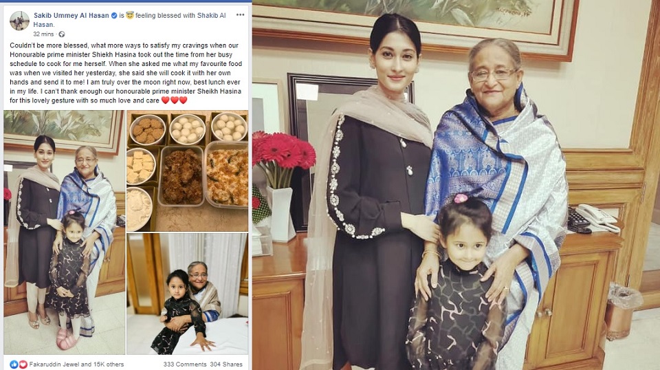 শনিবার দুপুরে প্রধানমন্ত্রী শেখ হাসিনার সঙ্গে সৌজন্য সাক্ষাতে যান সাকিব আল হাসান ও তার পরিবার। সেখানে সাকিবের স্ত্রী উম্মে আল হাসান শিশিরকে আতিথেয়তায় মুগ্ধ করেন প্রধানমন্ত্রী।