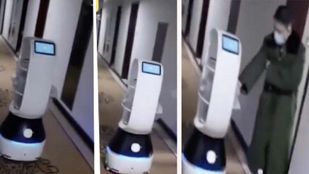 রোববার এই ঘটনার ভিডিও করে রাখেন ওই হোটেলের এক অতিথি। তাতে দেখা গেছে, রোবট দরজার সামনে গিয়ে দাঁড়াচ্ছে। লোকজন বের হয়ে তাদের কাছ থেকে খাবার নিয়ে নিচ্ছে।