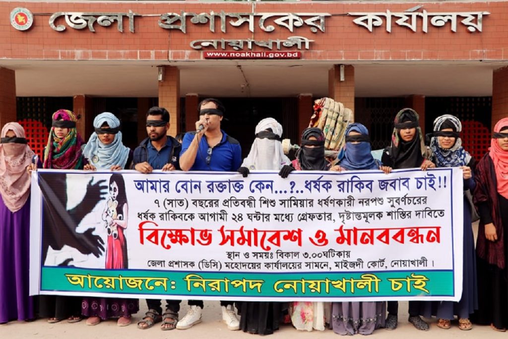 নোয়াখালী জেলা প্রশাসক কার্যালয়ের সামনে বিকেল ৪টায় জেলার সুবর্ণচর ও বেগমগঞ্জ উপজেলায় প্রতিবন্ধীসহ দুই শিশুকে ধর্ষণের প্রতিবাদ ও সর্ব্বোচ্চ শাস্তি মৃত্যুদণ্ডের দাবিতে মানববন্ধন করেছে বৃহত্তর নোয়াখালীর সর্ব বৃহৎ সামাজিক সংগঠন নিরাপদ নোয়াখালী চাই ।