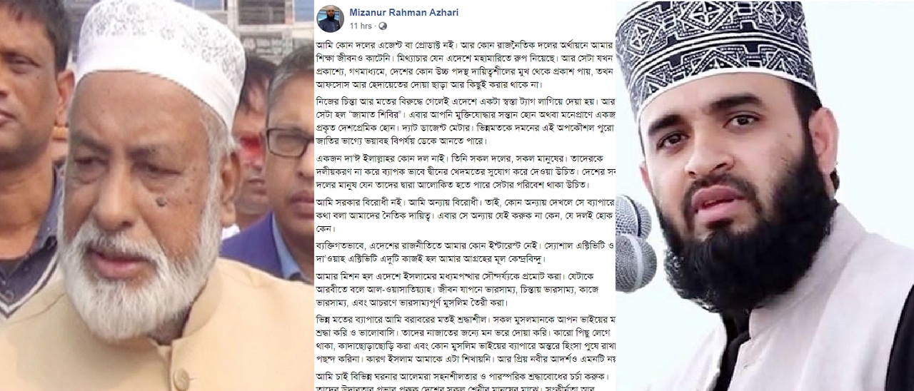 এ বিষয়ে বুধবার রাত পৌনে ১২টায় নিজের ভেরিফায়েড ফেসবুক পেজে দীর্ঘ স্ট্যাটাস দেন আজহারী।আজহারী লেখেন, তিনি ইসলামের একজন দায়ী। দ্বীনের খেদমতে তিনি কাজ করে যাচ্ছেন। ইসলামের মধ্যমপন্থার সৌন্দর্যকে প্রমোট করাই তার উদ্দেশ্য।