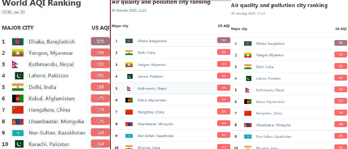 তবে, বেলা বাড়ার সাথে সাথে বায়ু দূষণের মাত্রা কিছুটা কমতে দেখা গেছে। এতে ঢাকার অবস্থান শীর্ষে থাকলেও পরবর্তী স্থানগুলোতে পরিবর্তন লক্ষ্য করা গেছে।