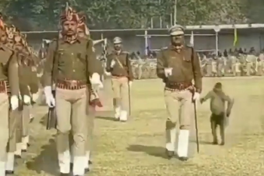 ভিডিওতে দেখা গেছে, মহড়ার সময় পেছন থেকে লাফ দিয়ে এসে ওই পুলিশ সদস্যকে লাথি মারে একটি হনুমান। পেছন ফিরে এটা দেখে যারপরনাই বিব্রত হন ওই পুলিশকর্মী।