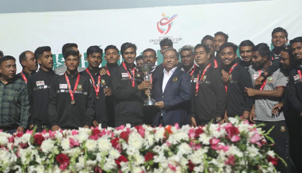 হাজার হাজার দর্শকের উপস্থিতেতে হোম অব ক্রিকেট শের-ই-বাংলা ক্রিকেট স্টেডিয়ামে সংবর্ধনা দেয়া হয় বিশ্ব চ্যাম্পিয়ন যুব বাংলাদেশ দলকে। মূল মাঠে কেক কেটে চ্যাম্পিয়নদের বরণ করে নেয় বিসিবি।