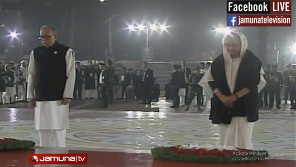 বৃহস্পতিবার দিবাগত রাত ১১টা ৫৯ মিনিটে শহীদ মিনারের শহীদ বেদিতে পুষ্পস্তবক অর্পণ করে শহীদদের প্রতি শ্রদ্ধা নিবেদন করেন রাষ্ট্রপতি ও প্রধানমন্ত্রী।