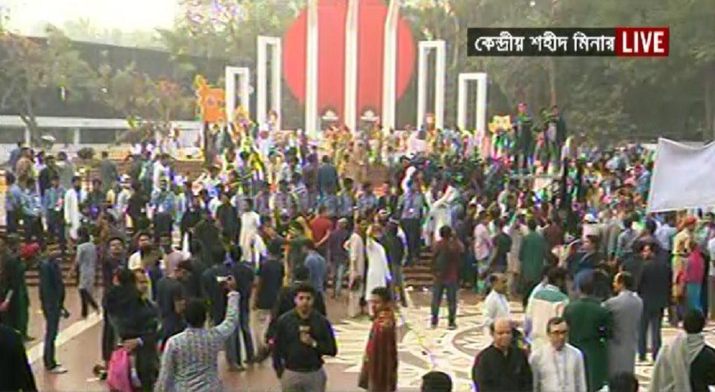 প্রথমে রাত ১২টা ১ মিনিটে রাষ্ট্রপতি আবদুল হামিদ এবং পরে প্রধানমন্ত্রী শেখ হাসিনা শহীদ মিনারে পুষ্পস্তবক অর্পণ করেন। এরপর কিছুক্ষণ নীরবে দাঁড়িয়ে, ভাষা আন্দোলনের শহীদদের স্মৃতির প্রতি গভীর শ্রদ্ধা জানান। পরে দলের মন্ত্রীবর্গ ও সিনিয়র নেতাদের নিয়ে আওয়ামী লীগ সভাপতি হিসাবে পুষ্পস্তবক অর্পণ করেন শেখ হাসিনা। এরপর জাতীয় সংসদের স্পিকার শিরীন শারমিন চৌধুরী ও ডেপুটি স্পিকার ফজলে রাব্বী মিয়া কেন্দ্রীয় শহীদ মিনারে পুষ্পস্তবক অর্পণ করেন। ভাষা শহীদদের প্রতি ফুল দিয়ে শ্রদ্ধা জানান বিরোধী দলীয় নেতা। তারপরই তিন বাহিনীর প্রধানগণ পুষ্পস্তবক অর্পণের মধ্যদিয়ে একুশের ভাষা শহীদদের প্রতি শ্রদ্ধা জানান।