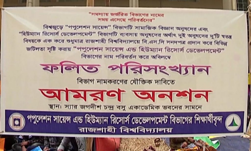 রাজশাহী বিশ্ববিদ্যালয়ে পপুলেশন সায়েন্স অ্যান্ড হিউম্যান রিসোর্স ডেভলোপমেন্ট বিভাগের নাম পরিবর্তনের দাবিতে শিক্ষার্থীদের আমরণ অনশন দ্বিতীয় দিনে গড়িয়েছে। এরই মধ্যে অসুস্থ হয়ে পড়েছেন ১১ শিক্ষার্থী।
