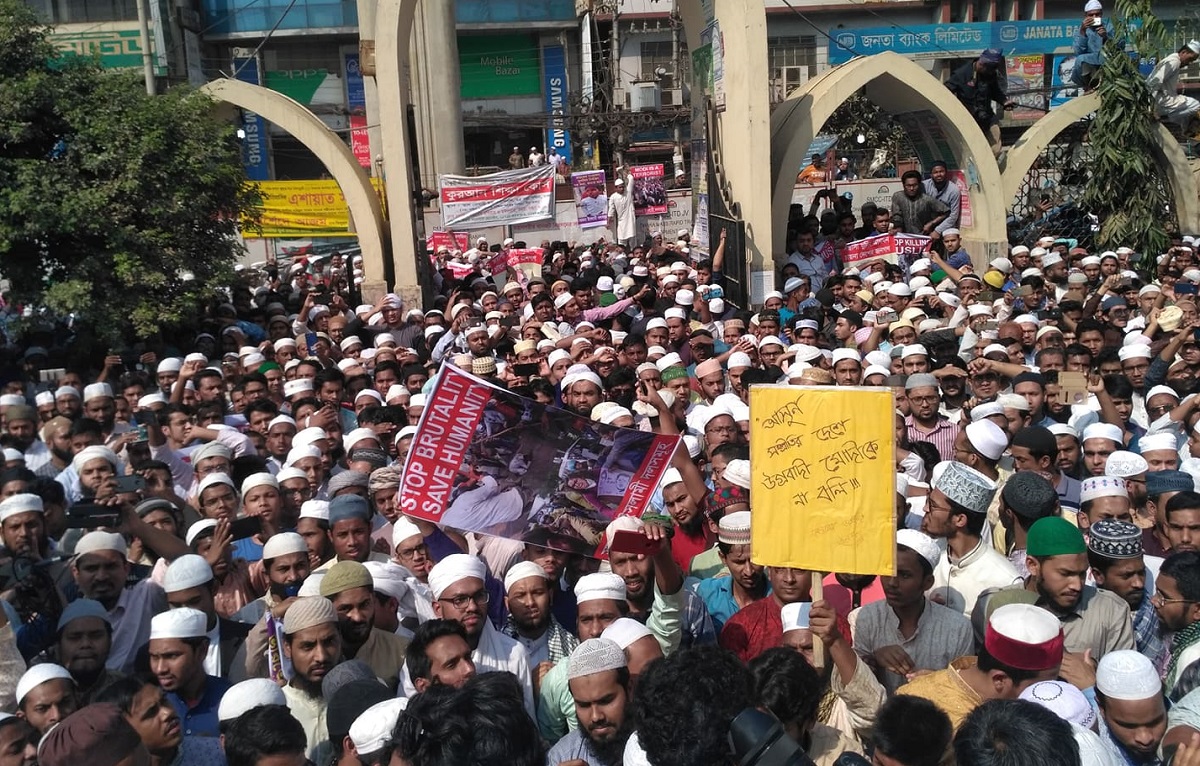 এর আগে জুমার নামাজ শেষে শুরু হয় বিক্ষোভ সমাবেশ। এতে বক্তারা বলেন, ভারতের সাম্প্রদায়িক মোদী সরকার সংখ্যালঘু মুসলিমদের ওপর নির্মম নির্যাতন চালাচ্ছে। মুসলমানমানদের বাড়ি ঘরে আগুন দিয়ে তাদের ঘরবাড়ি থেকে উচ্ছেদ করা হচ্ছে। নারী ও শিশুদের ওপরও নির্মম নির্যাতন চালানো হচ্ছে। বিশ্ব মুসলিম সম্প্রদায়কে ভারতের মুসলমানের পাশে দাঁড়ানোর আহ্বান জানান বক্তারা।