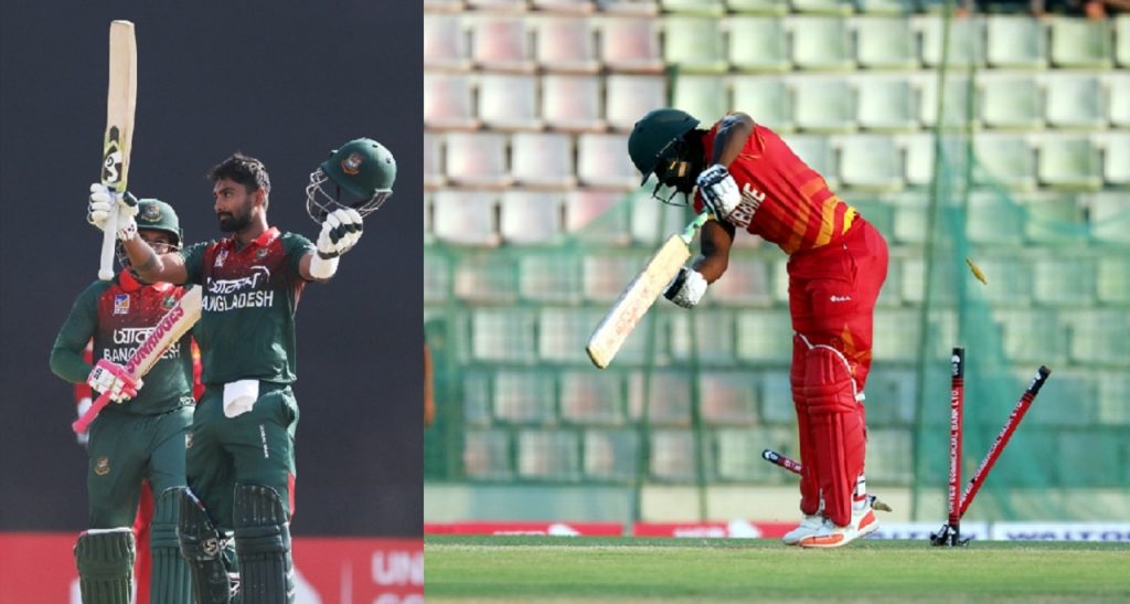 রোববার টাইগারদের ছুঁড়ে দেয়া ৩২২ রানের লক্ষ্যে ব্যাট করতে নেমে ব্যাটিং বিপর্যয়ে পড়ে জিম্বাবুয়ে। মোহাম্মদ সাইফউদ্দিনের বোলিং তাণ্ডবে দিশেহারা হয়ে যায় জিম্বাবুয়ে। ইনিংসের দ্বিতীয় ওভারে বোলিংয়ে এসেই জিম্বাবুয়ের ওপেনার টিনেশে কামুনহুকউইয়ের উইকেট তুলে নেন সাইফ। তার বলে অসহায়ের মতো বোল্ড হয়ে ফেরেন জিম্বাবুয়ের এ ওপেনার। ১.৪ ওভারে ১ রানে প্রথম উইকেট হারায় জিম্বাবুয়ে।