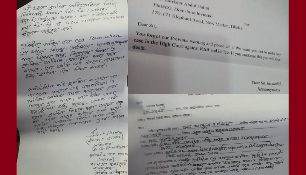 জিডিতে তিনি উল্লেখ করেন, গত ১১ মার্চ বাসায় একটি অজ্ঞাতনামা ব্যক্তির কাছে থেকে হুমকির চিঠি পেয়েছেন। যেখানে বলা হয়েছে, আপনি আমাদের আগের ফোন ও সতর্কবাণী ভুলে গেছেন। আপনি যদি হাইকোর্টে র্যাব ও পুলিশের বিরুদ্ধে মামলা পরিচালনা অব্যাহত রাখেন তবে মৃত্যু মুখে পতিত হবেন।