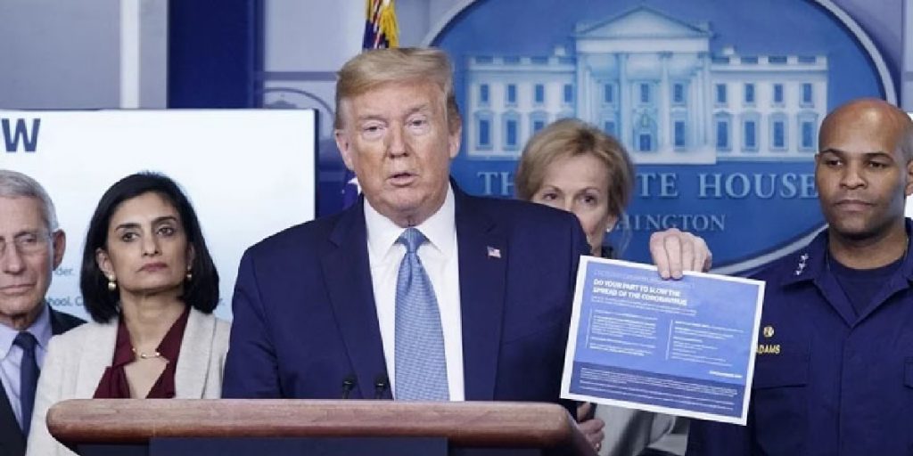 করোনাভাইরাস মোকাবেলায় গঠিত জাতীয় কমিটির সদস্যদের সঙ্গে নিয়ে সংবাদ সম্মেলনে বক্তব্য রাখেন মার্কিন প্রেসিডেন্ট।