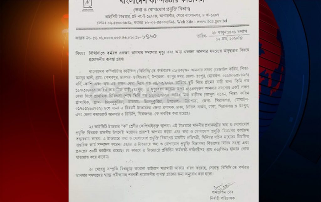 রোববার (১৫মার্চ) সংস্থাটির পক্ষ থেকে এ চিঠি দেওয়া হয়। এতে বলা হয়, বাংলাদেশ কম্পিউটার কাউন্সিলে কর্মরত এক আনসার সদস্য রেজাউল করিম সর্দি-কাশি ও জ্বরের লক্ষণ দেখা দিলে গত ৪ মার্চ ছুটি নিয়ে গ্রামের বাড়ি যান। পরে তিনি ১১ মার্চ মারা যান। তার গ্রামের বাড়ি রংপুর জেলার কেশবপুর গ্রামে।