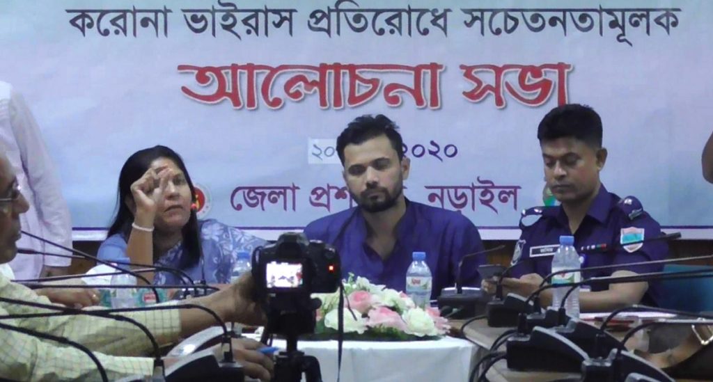 শুক্রবার সকাল ১১ টায় জেলা প্রশাসকের সম্মেলন কক্ষে করোনা বিষয় প্রতিরোধে সচেতনতা মূলক আলোচনা সভায় সভাপতিত্ব করেন জেলা প্রশাসক আনজুমান আরা। প্রধান অতিথি ছিলেন নড়াইল-২ আসনের এমপি মাশরাফী বিন মোর্ত্তজা।
