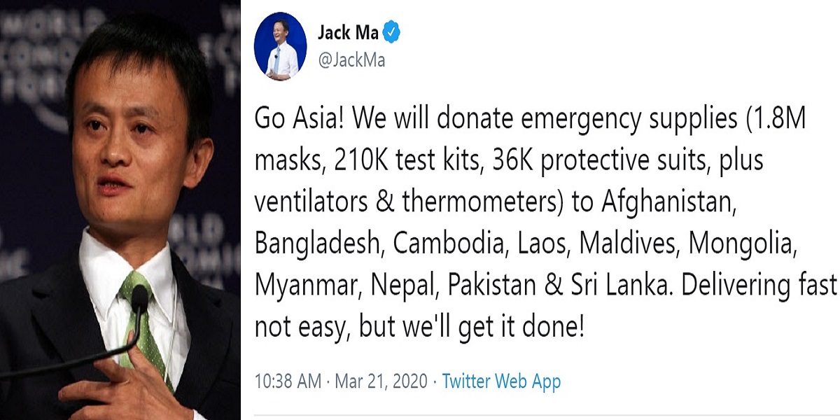 টুইটে তিনি বলেন, এগিয়ে যাও এশিয়া! আমরা আফগানিস্তান, বাংলাদেশ, কম্বোডিয়া, লাওস, মালদ্বীপ, মঙ্গোলিয়া, মায়ানমার, নেপাল, পাকিস্তান ও শ্রীলঙ্কায় জরুরি সরঞ্জাম সরবরাহ করবো। এর মধ্যে রয়েছে- ১৮ লক্ষ মাস্ক, ২ লক্ষ ১০ হাজার টেস্ট কিট, ৩৬ হাজার প্রটেক্টিভ স্যুটসহ ভেন্টিলেটর, এ্যম্পুল ও থার্মোমিটার। তবে এই সরবরাহ দ্রুত করাটা সহজ কাজ নয় তবে আমরা এটি সম্পন্ন করবোই।