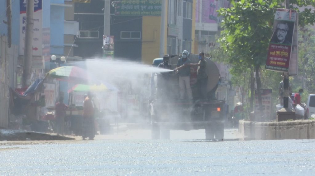করোনাভাইরাস প্রতিরোধে জনসচেতনতা তৈরির পাশাপাশি জীবাণুনাশক পানি ছিটাচ্ছে ঢাকা উত্তর সিটি কর্পোরেশন।