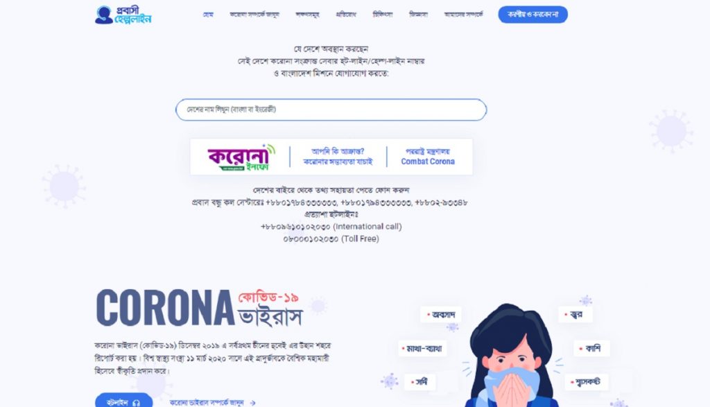 এই ওয়েবসাইটে ঢুকলে প্রবাসী বাংলাদেশিরা করোনাভাইরাস সংক্রান্ত বিভিন্ন তথ্য পাবেন। করোনা সংক্রমণ প্রতিরোধে নানা তথ্যের পাশাপাশি এখানে প্রবাসীদের পরামর্শ দিয়ে সহায়তা করা হচ্ছে। পাশাপাশি, বিভিন্ন দেশে অবস্থানরত প্রবাসীদের জন্য সে দেশের হটলাইন নম্বরও দেয়া আছে।