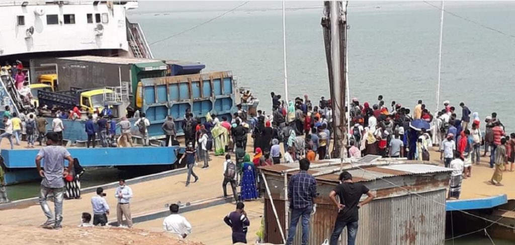 করোনাভাইরাসের কারণে লকডাউন উপেক্ষা করে রাজবাড়ীর দৌলতদিয়া ফেরি ঘাটে ভিড় করেছেন রাজধানী ঢাকামুখী যাত্রীরা। এসব যাত্রীরা সামাজিক দূরত্ব না মেনে গাদাগাদি করে নদী পার হতে ফেরিতে উঠছেন।