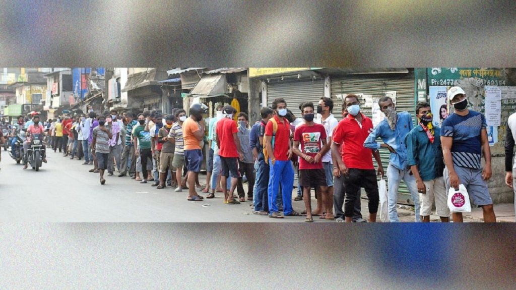 সোমবার বেলা ৩ টার দিকে মদের দোকান খুললে, লাইন হয় প্রায় এক কিলোমিটার দীর্ঘ। লাইনে পাঁচ জনের বেশি দাঁড়ানো যাবে না, এ কথা মানে নি কেউ। তবে মাস্ক ছাড়া মদ দেওয়া হবে না, এই শর্ত থাকায় লাইনে মাস্ক পরেছিলেন প্রায় সকলেই।