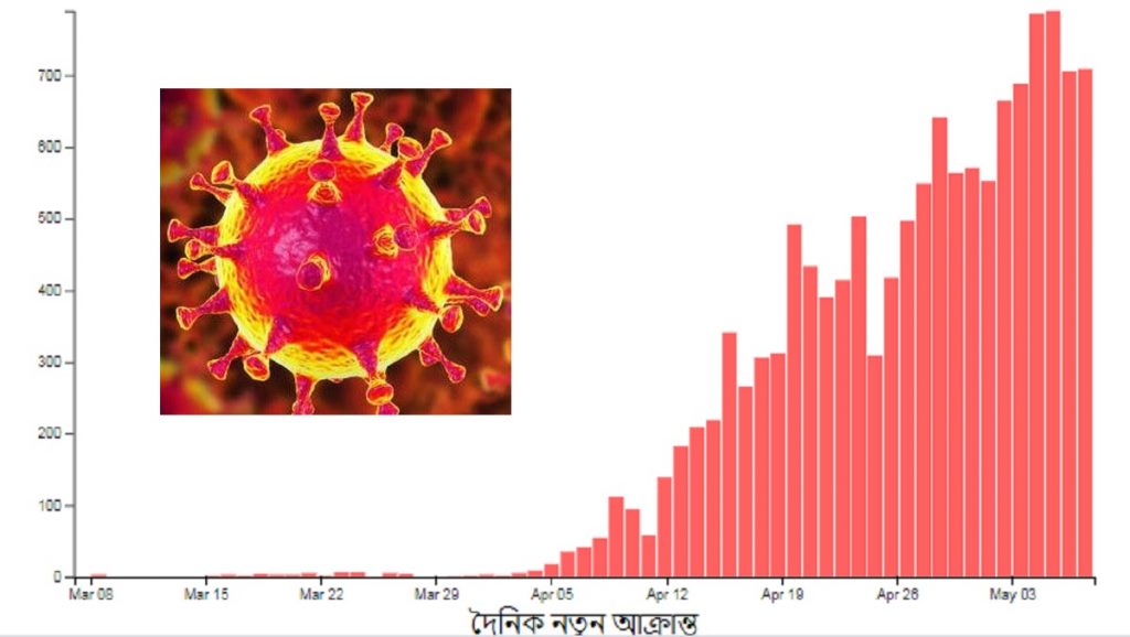 এছাড়া টানা ৪ দিন দেশে করোনাভাইরাসে আক্রান্ত রোগীর সংখ্যা সাতশ’র ওপরে। বৃহস্পতিবার সংখ্যা কিছু কমলেও শুক্রবার তা আবার বেড়েছে ৩ জন। এর আগে প্রথম ৭ শতাধিক রোগী চিহ্নিত হয় গত ৫ মে। সেদিন রোগী শনাক্ত হয় ৭৮৬ জন। পরদিন ৬ মে ৭৯০ জন এবং বৃহস্পতিবার ৭০৬ জনের দেহে করোনাভাইরাস শনাক্ত হয়।
