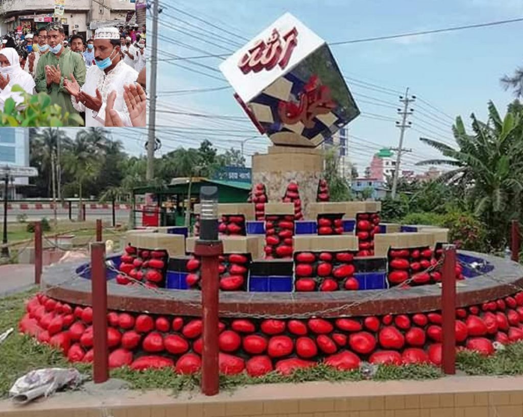 সরেজমিনে দেখা গেছে, শহরের মহিপাল পেট্টোল পাম্প সংলগ্ন মিয়াজী বাড়ী সম্মুখস্ত মহাসড়কের পাশে পৌরসভার অর্থায়নে মহান আল্লাহ ও হযরত মুহাম্মদ (সা.) এর নামে ভাষ্কর্য নির্মাণ করা হয়। নির্মাণের দায়িত্ব পান ঠিকাদারি প্রতিষ্ঠান বেস্ট কনস্ট্রাকশন। ভাস্কর্যটি উচ্চতায় সাড়ে ১৪ ফূট। সুউচ্চে আরবী অক্ষরে ‘আল্লাহু’ ও ‘মুহাম্মদ’ লেখা রয়েছে। রাতে আলোর জ্বলকানিতে পানির ফোয়ারায় সৌন্দর্যে বাড়তি মাত্রা যোগ হবে।